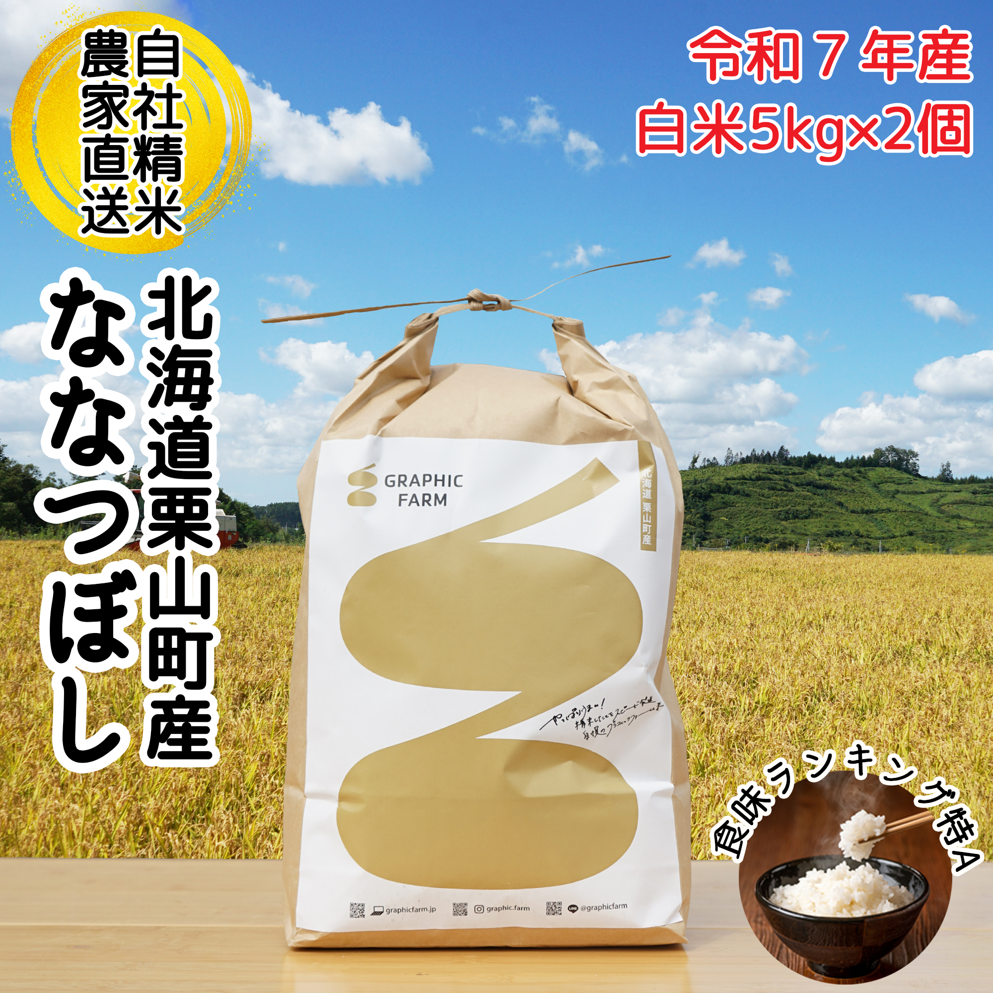 自然豊かな北海道栗山町の農場で育てた、令和7年産ななつぼしを、発送直前に精米し農家直送でお届けします。